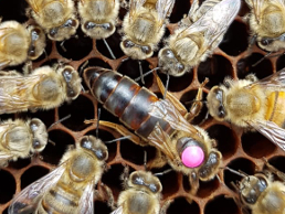 Königinnen werden mit einem kleinen Farbpunkt oder einem farbigen Plättchen auf ihrem Rückenpanzer gezeichnet. Zum einen findet man sie auf den Waben leichter, zum anderen weiß man dadurch, wie alt sie ist. Denn jedes Jahr hat seine einheitlich festgelegte Farbe.